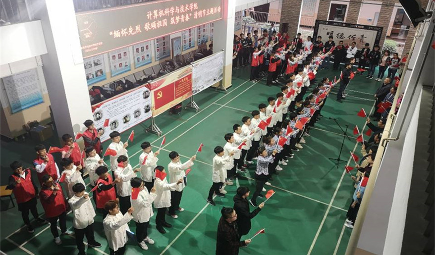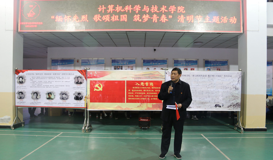 活动在声情并茂的诗歌朗诵《百年回眸,岁月悠悠》中拉开序幕,接着学生代表秦天宇发言,表达了当代青年缅怀先烈、铭记历史、发奋学习,为实现中华民族伟大复兴中国梦贡献青春力量的拳拳赤子心。为寄托对革命烈士的哀思,全体人员默哀一分钟;所有党员在庄严肃穆的气氛里重温入党誓词,再一次接受心灵的洗礼。