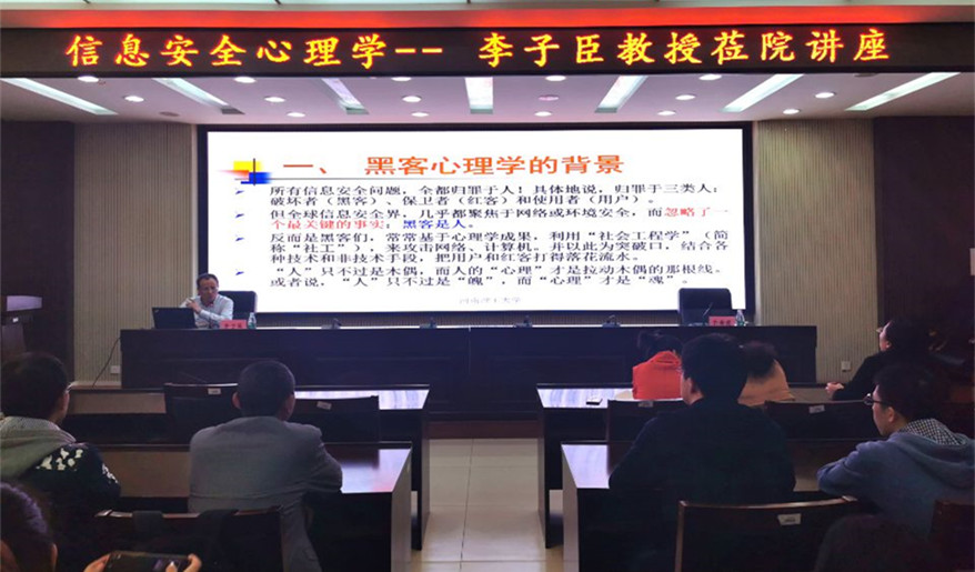10月18日下午,为庆祝必赢242net官网建校110周年以及必赢242net官网建院20周年,我院特聘教授北京印刷学院李子臣教授莅院,在201会议室作了一场题为《信息安全心理学》的学术报告,学院部分教师和全体研究生聆听了报告,报告会由副院长于金霞主持。