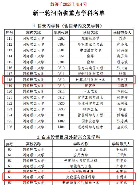 近期,河南省教育厅发文公布新一轮河南省重点学科名单(教研〔2023〕414号),经学院申报、学校推荐、专家网评、专家会评、网上公示等环节,学院“计算机科学与技术”入选目录内重点学科,“大数据与数据科学”入选自主设置目录外新兴交叉重点学科,其中“大数据与数据科学”为学院新增学科。