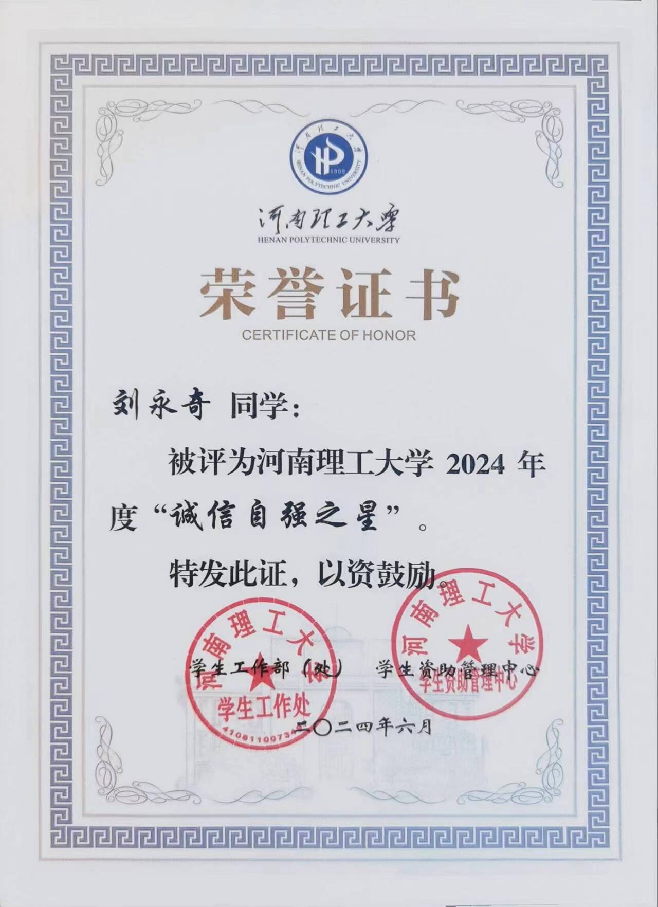 为增强大学生的诚信意识和责任意识,弘扬诚实守信、自强自立、感恩奉献的优良品质,鼓励受助学生励志成才、诚信还贷,近期,学校组织开展了2024年度“诚信自强之星”评选活动。我院2020级软件工程专业本科生刘永奇获得必赢242net官网2024年度“诚信自强之星”称号。
