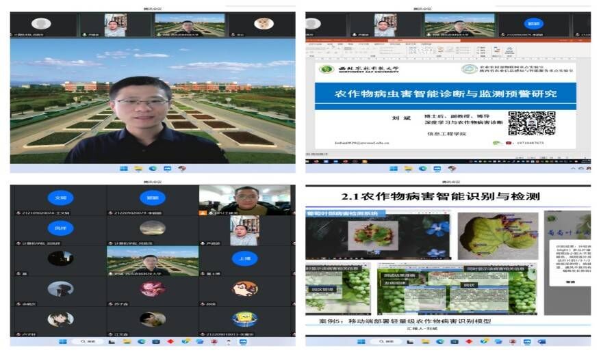 报告会上,刘斌教授从所在实验室的基本情况出发,围绕人才培养、学科竞赛、科研成果和未来工作计划等方面,详细介绍了农作物病虫害智能诊断与监测预警研究意义、方法与成果。刘斌教授以所在团队研发的多元信息融合远程实时可视化系统为例,分析了作物病害诊断的重要意义;介绍了在利用深度学习算法建立苹果等作物的病害诊断模型的过程中数据的采集与制作、算法的设计以及系统的部署等多个方面的研究思路;简要阐述了下一步的工作计划。此外,刘教授在报告会上还分享了其研究生的培养方式和取得的科创成果。最后,刘斌教授与线上师生进行了互动交流,对大家提出的疑问一一给予解答,与会人员受益匪浅。