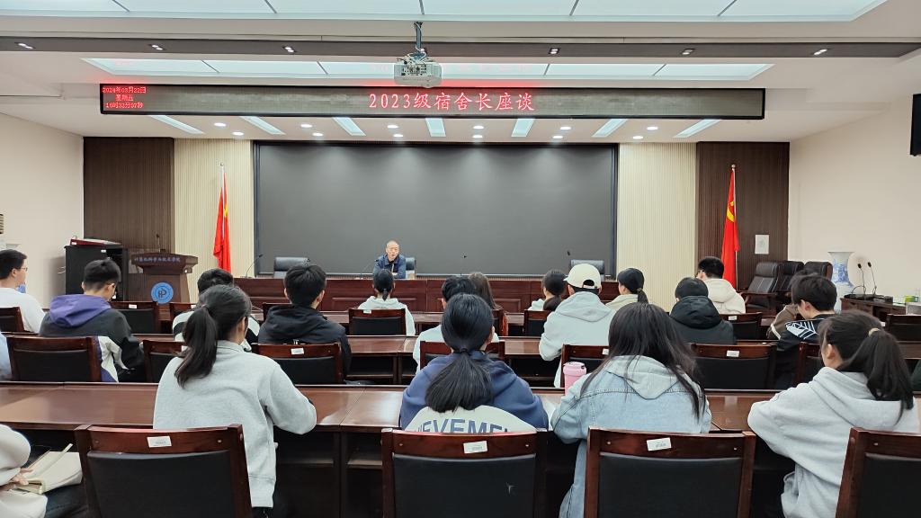 为教育引导学生养成良好生活习惯,树立优良学风,健康成长成才,3月22日下午,学院关工委在201会议室召开2023级宿舍长代表座谈会。关工委常务副主任朱天明出席会议与学生亲切座谈。座谈会由辅导员赵娜主持。