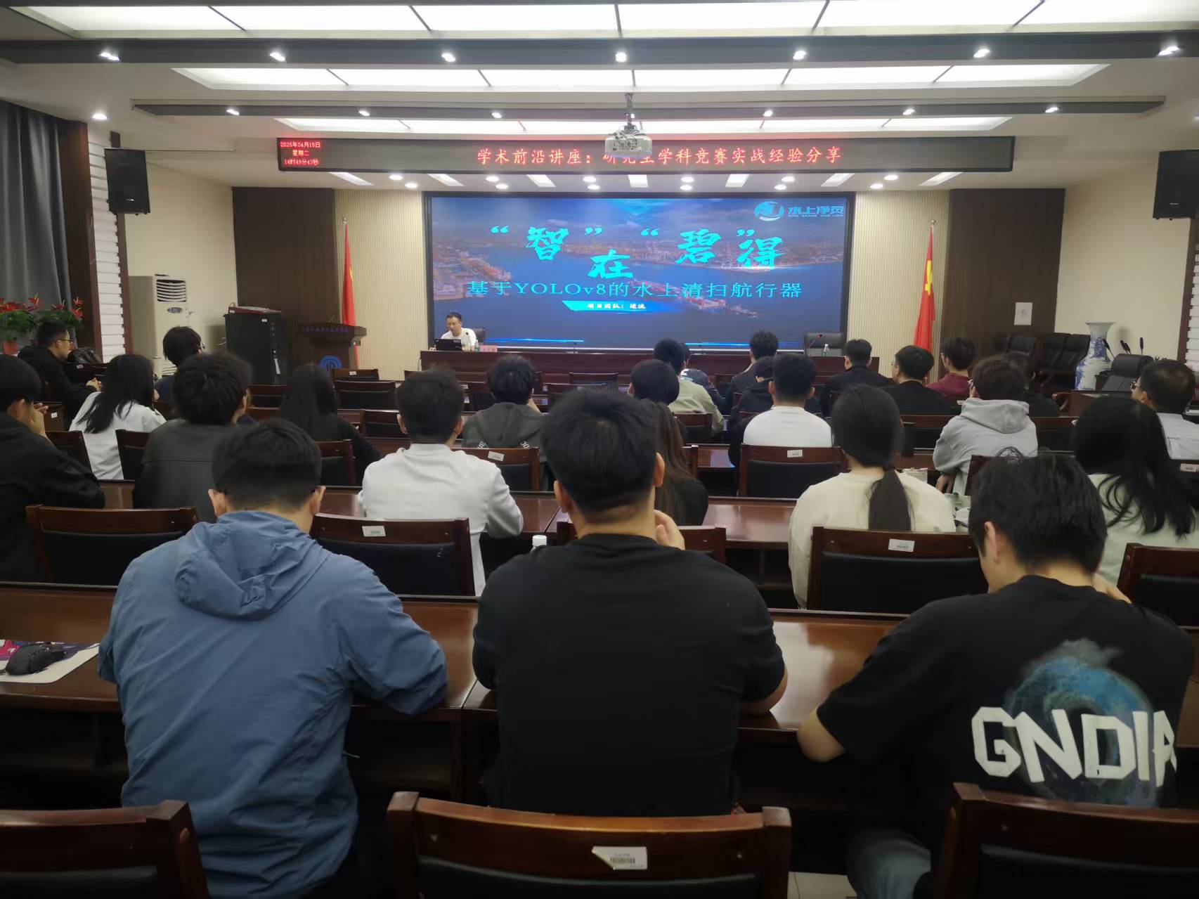 孙凯以“分布式高密度锚杆支护力监测系统”项目为案例,从项目背景、核心技术、成果展示及未来发展趋势四个维度进行系统讲解,并结合工程应用场景阐释了创新研究路径。随后王子豪展示“‘智’在‘碧’得——基于YOLOv8的水上清扫航行器”项目,通过分析水域污染治理痛点引出研发价值,借助实物模型演示和实测影像数据,重点解析了目标识别算法优化与航行器运动控制的技术突破。