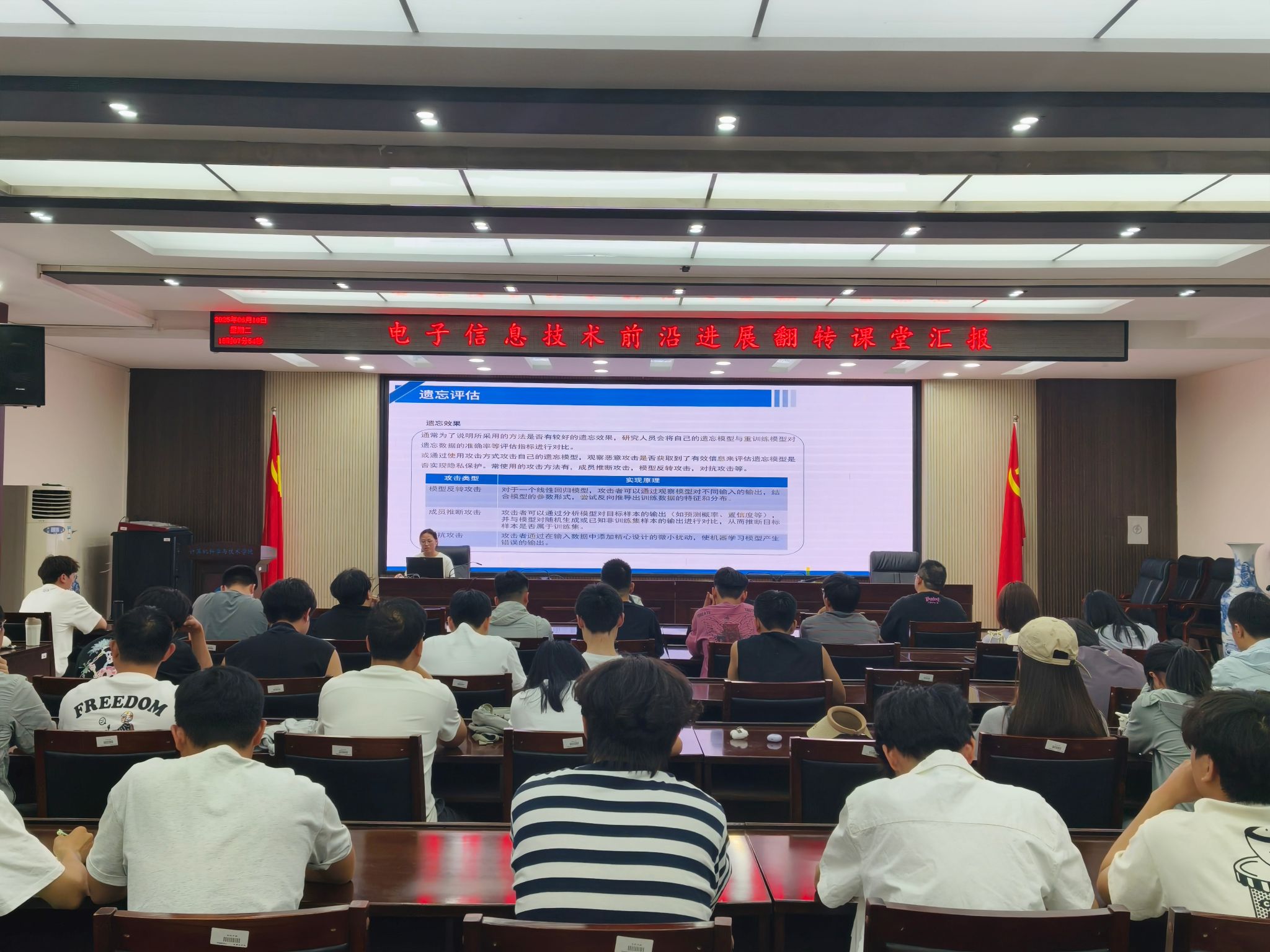 6月10日,电子信息技术前沿进展翻转课堂汇报在必赢242net官网201会议室开展。活动由主讲教师于金霞教授主持,物联网系主任张利红、研究生办公室工作人员、2024级电子信息专业硕士研究生近60人参加。